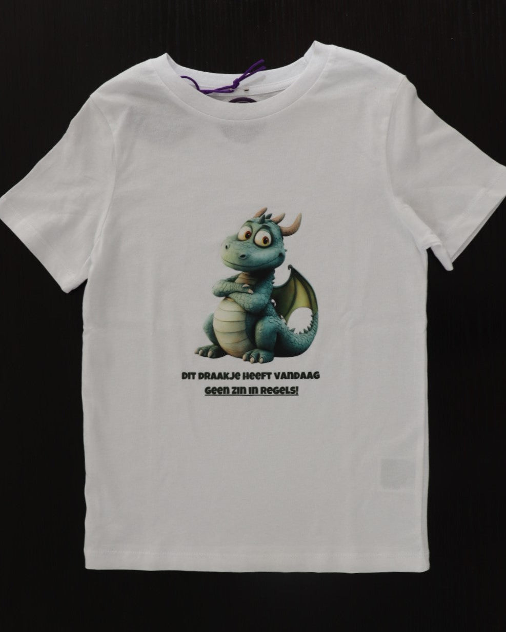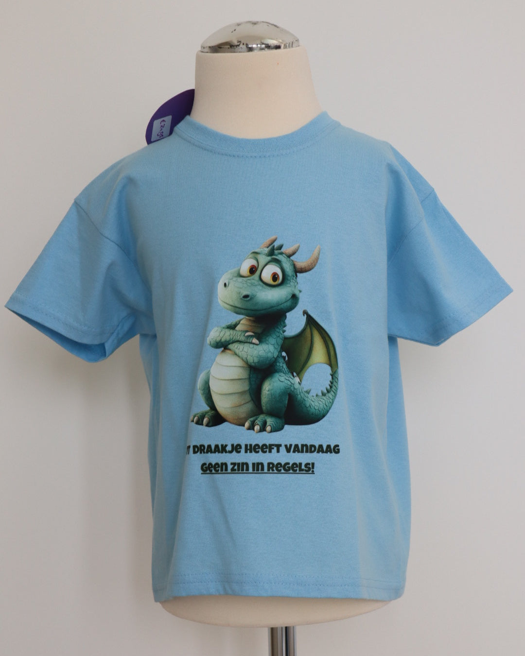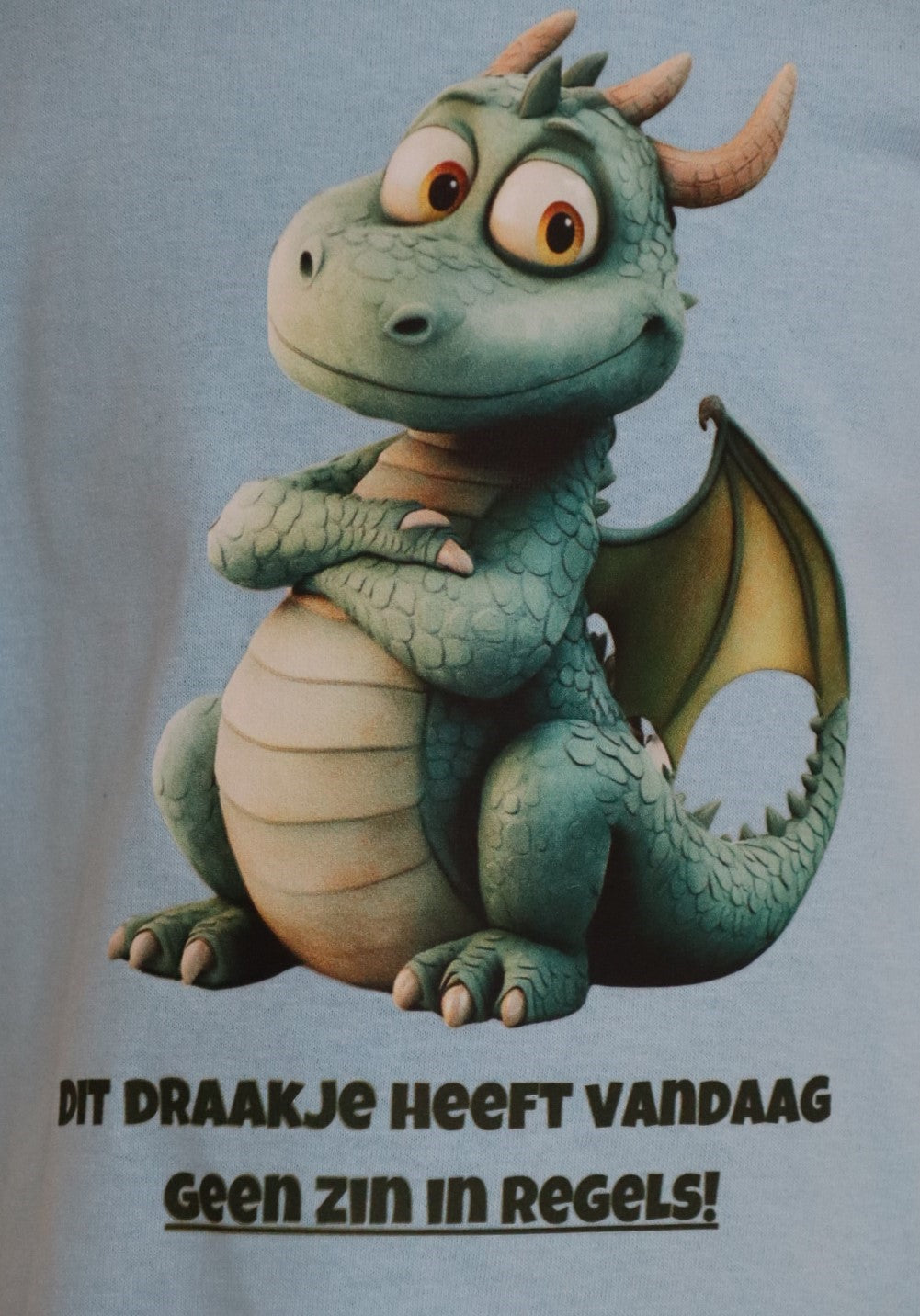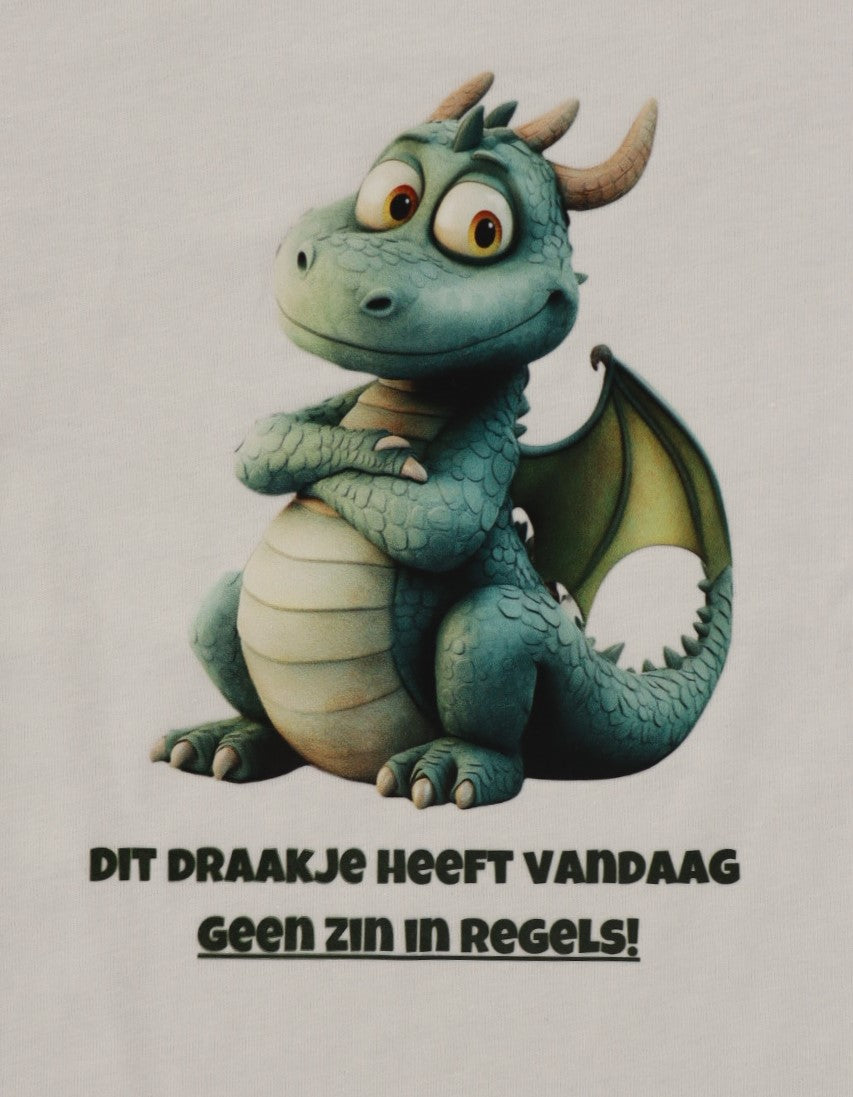 Dit draakje is stoer, eigenwijs en zit vol karakter. Of het nu gaat om opruimen, stilzitten of netjes doen — vandaag even niet! Met zijn trotse houding en brutale blik is dit shirt gemaakt voor kinderen met pit, die hun eigen pad durven te volgen.
