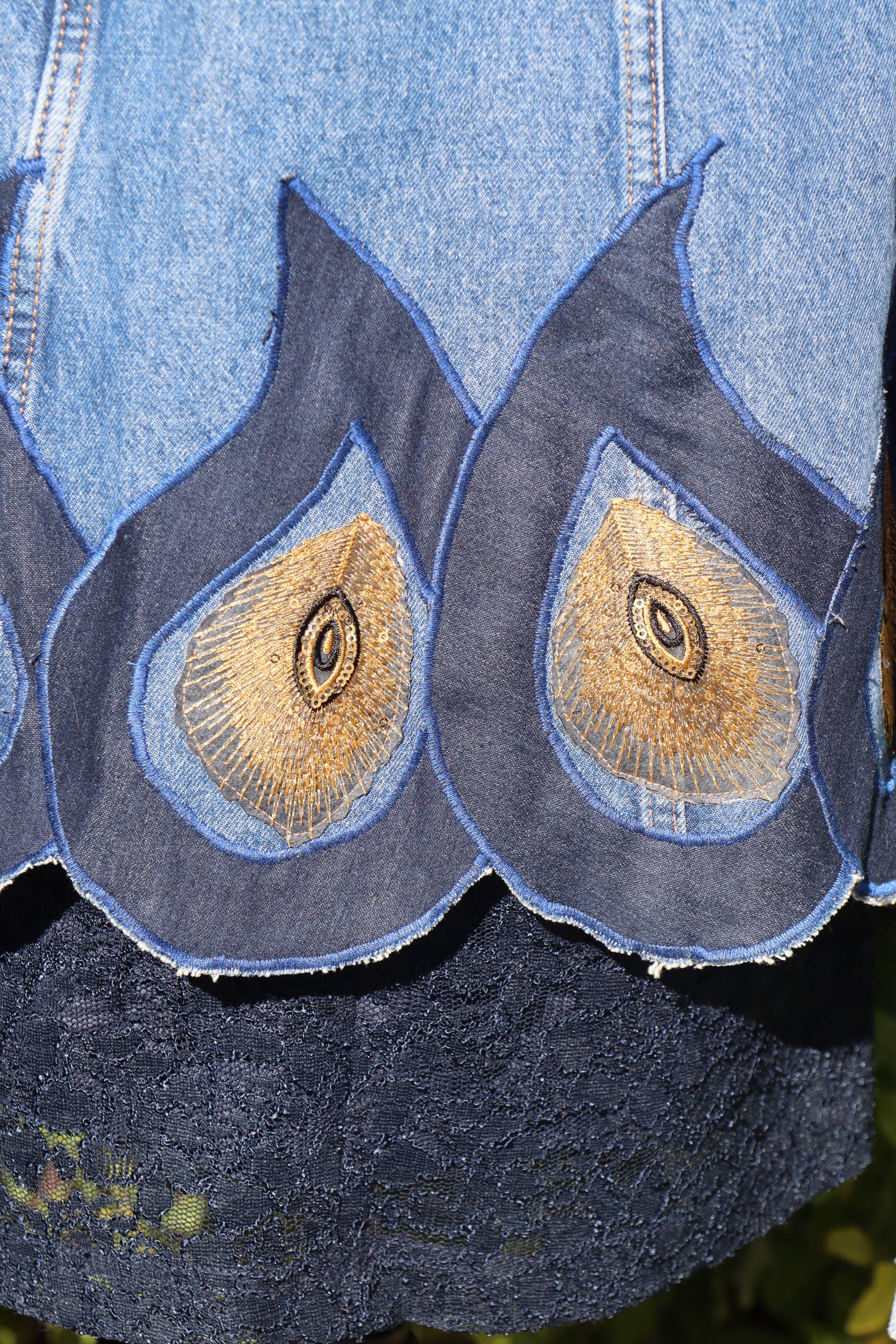 Een lang en elegant jasje met een ceintuur, ontworpen om op te vallen. De golvende onderkant is versierd met overlappende donkerblauwe druppelvormen, waarin gouden veeremblemen subtiel zijn verwerkt, die lijken te stralen als een oog. Deze verfijnde details komen ook kleiner terug op de mouwen. Een luxueus en kunstzinnig ontwerp dat klasse en mystiek combineert! 🌊✨