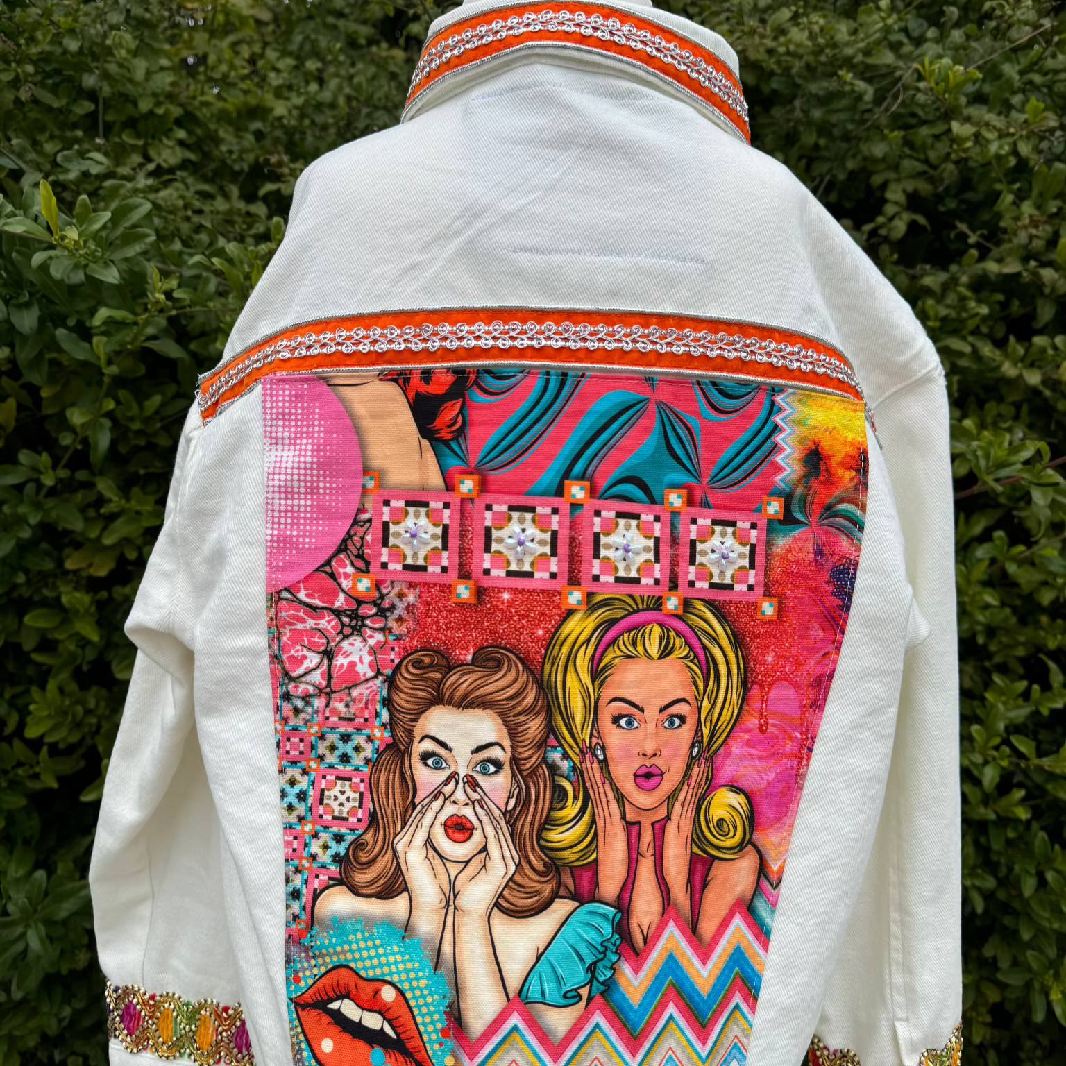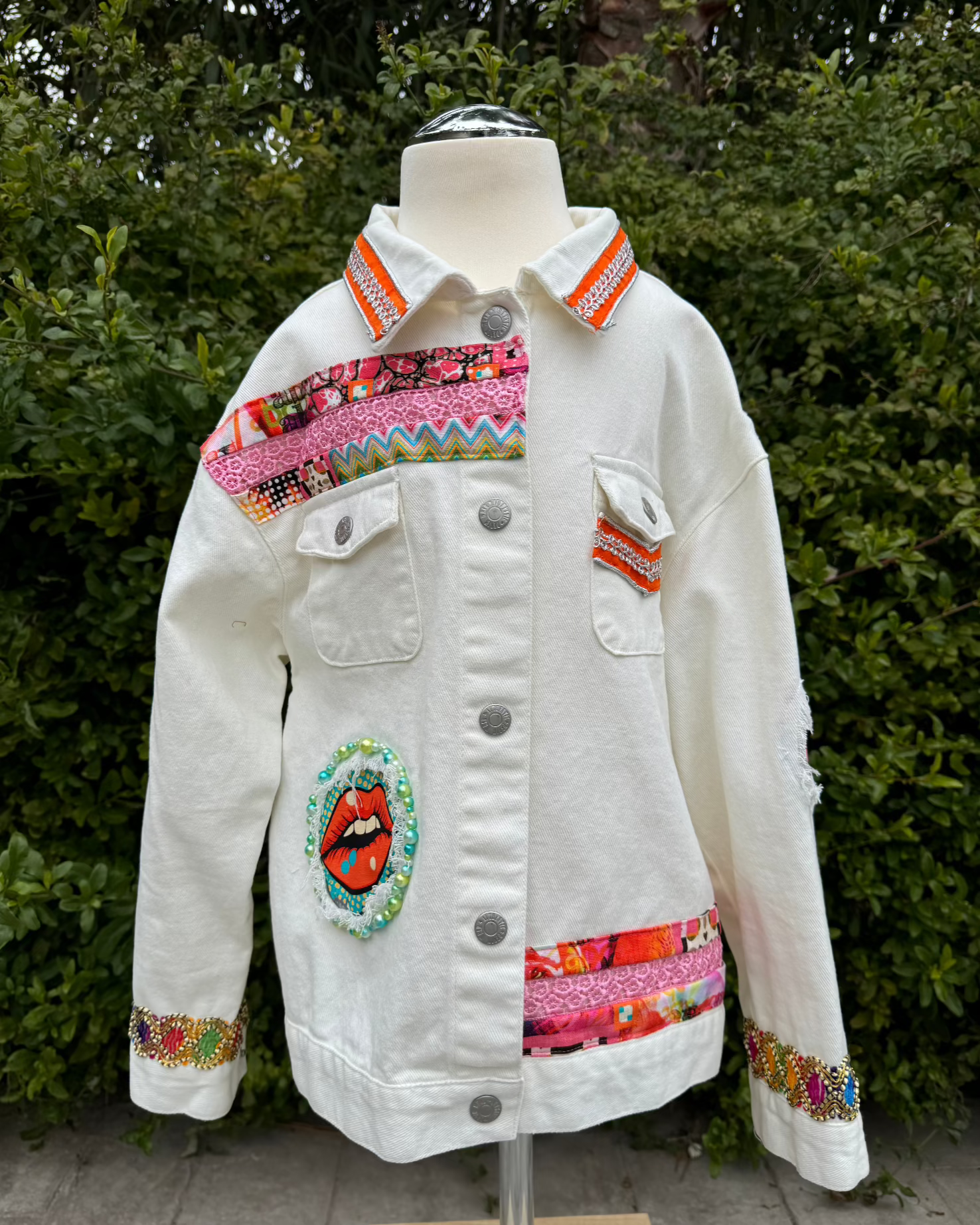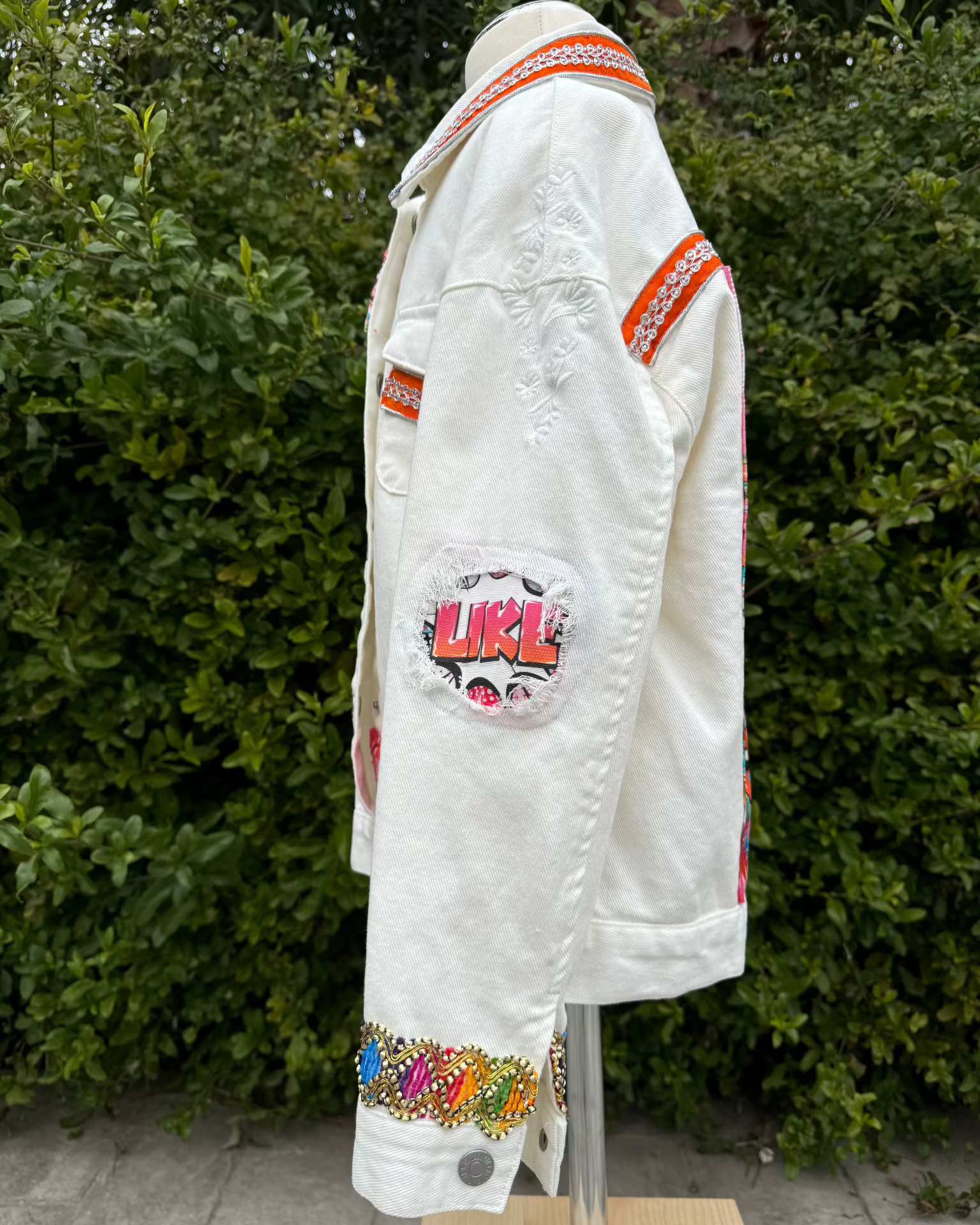 Dit unieke spijkerjasje heeft een vrolijke en kleurrijke uitstraling met subtiele vintage invloeden. De handgemaakte details en speelse patronen maken het een echte blikvanger. Verkrijgbaar als moeder-dochter set voor een perfecte match!