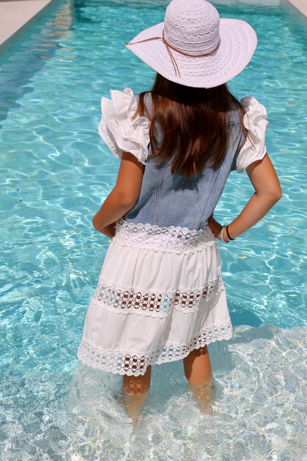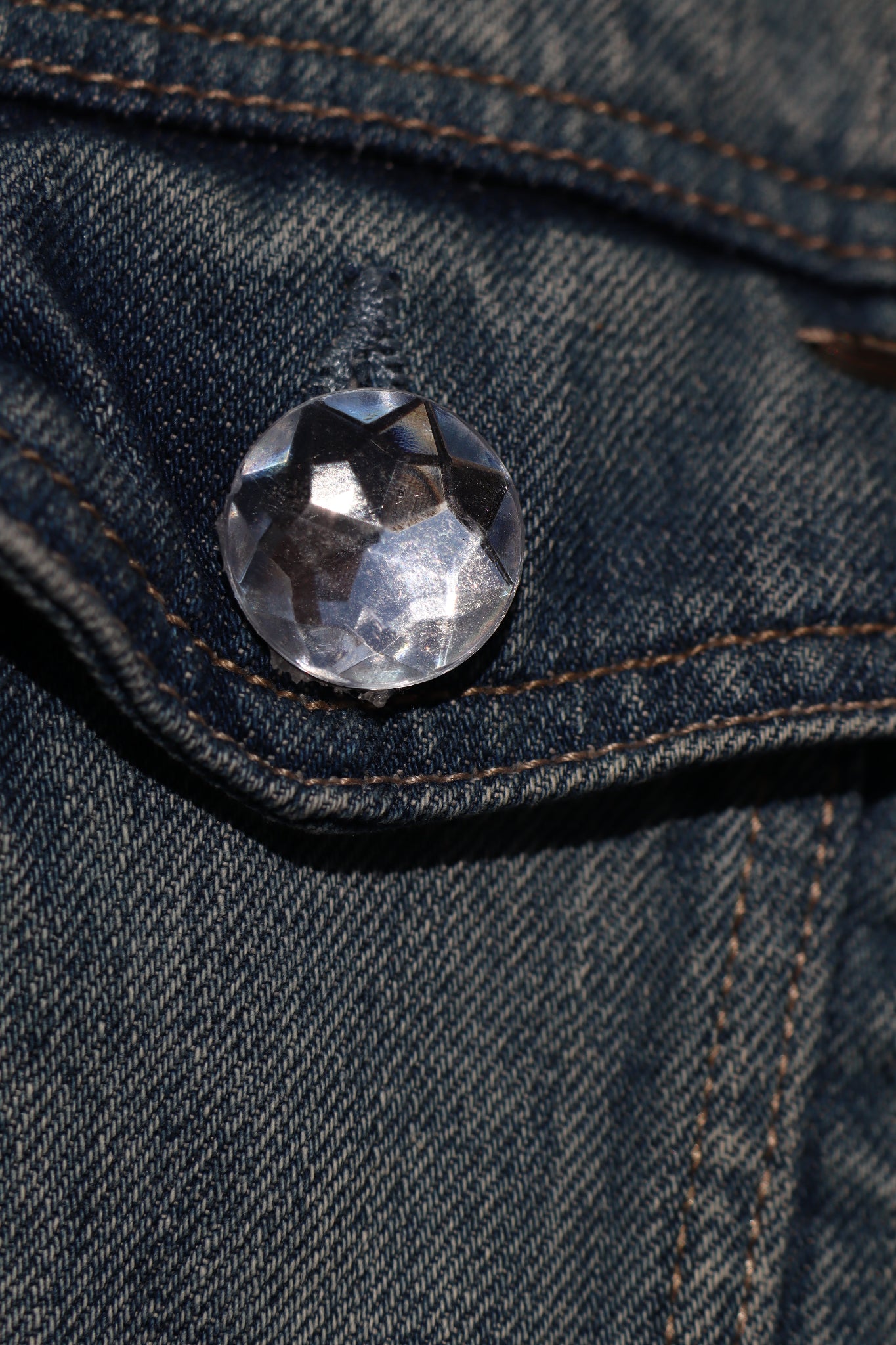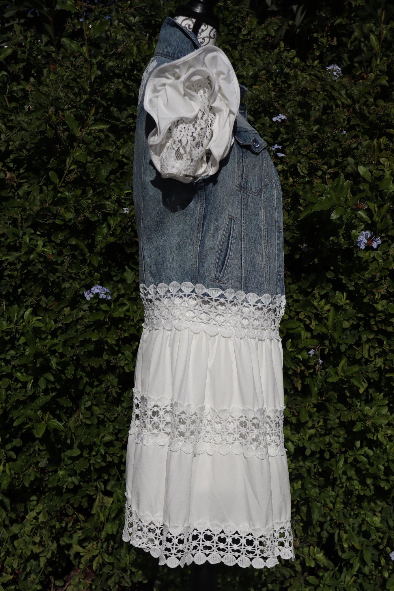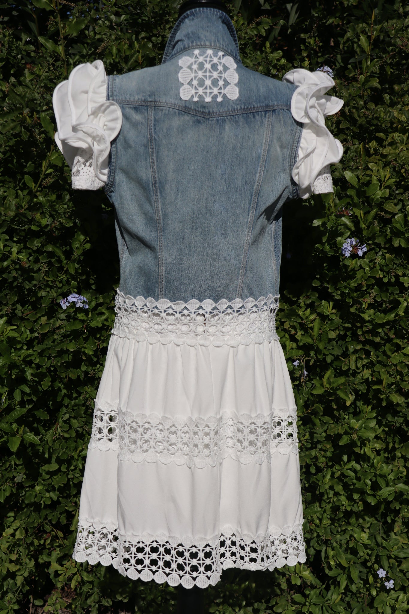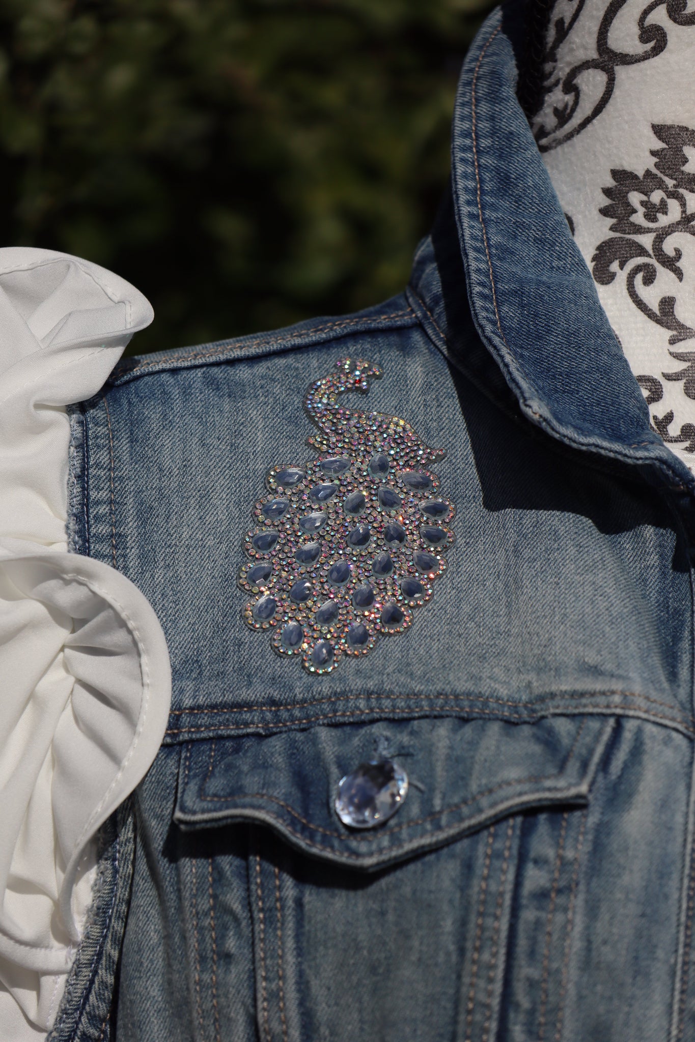 Dit verfijnde spijkerjasje straalt pure elegantie uit met zijn opgekrulde mouwtjes en een prachtig wit katoenen rokje, afgewerkt met delicaat kant. Het pronkstuk is het stralende pauwtje op de voorkant, rijkelijk bezet met fonkelende strassteentjes.