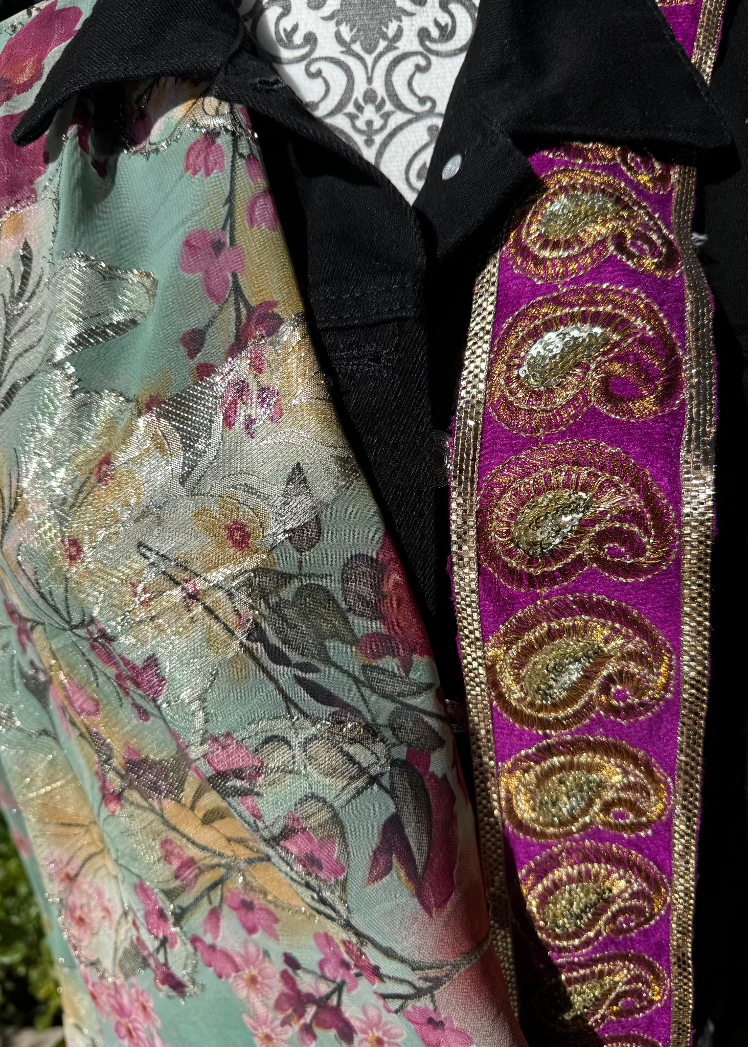 De kraag kan verrijkt worden met een prachtig patroon in warme tinten, en de luchtige, gebloemde stof aan de zijkant voegt een dromerige, bijna magische touch toe. Dit jasje is voor wie durft op te vallen, een vleugje luxe omarmt en een tijdloze elegantie wil uitstralen.