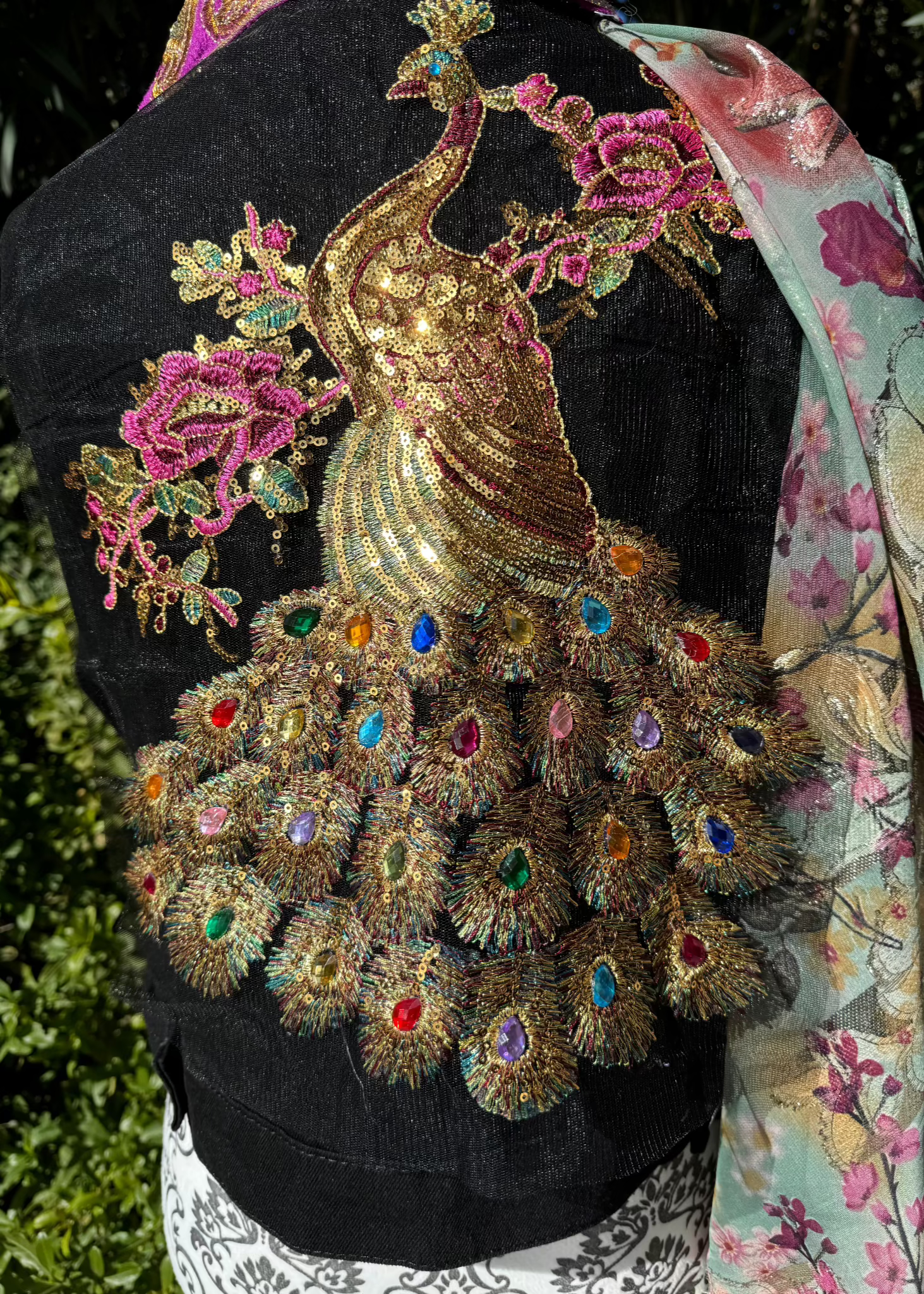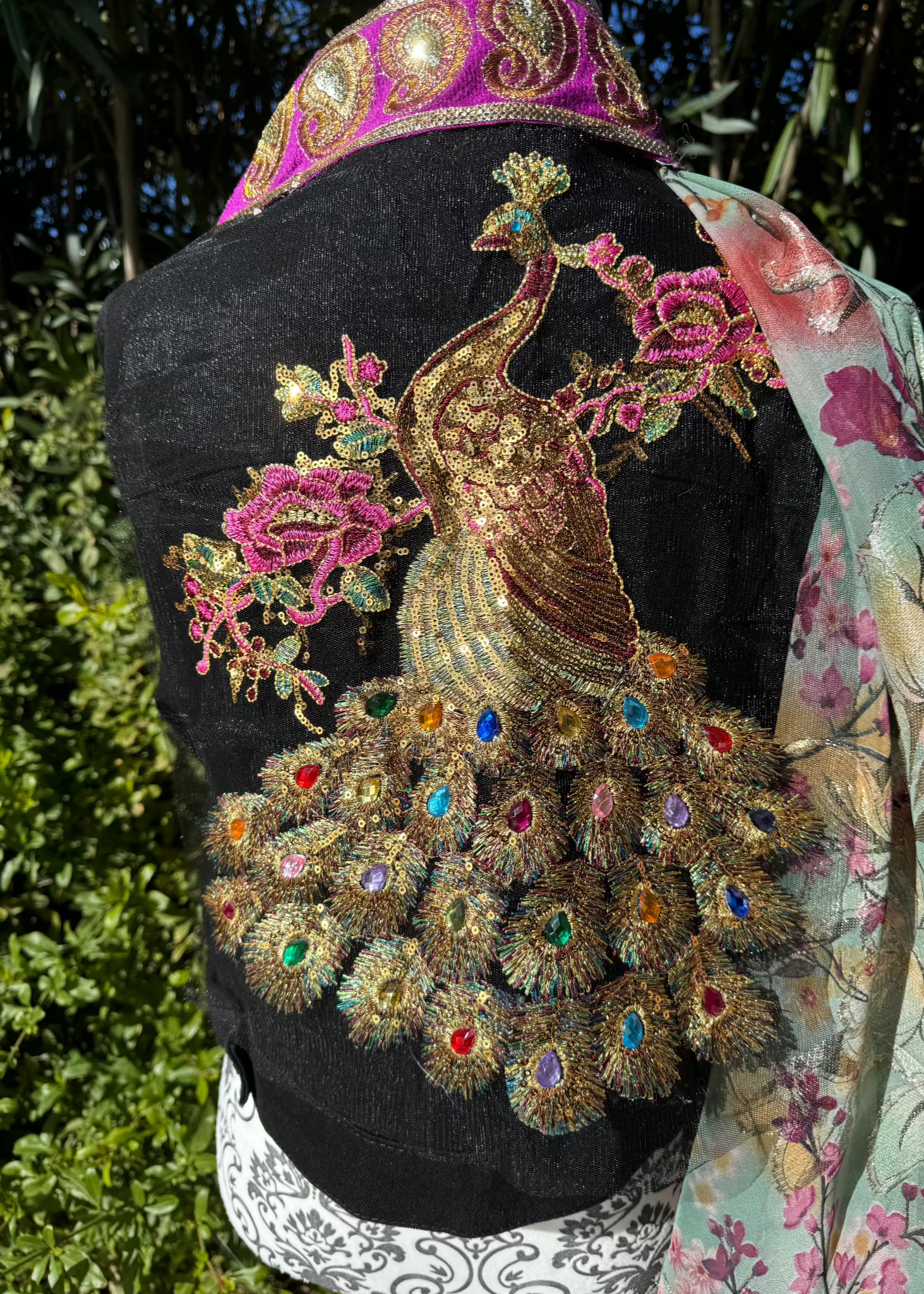 Majestic Allure is een koninklijk meesterwerk dat de pracht van de pauw tot leven brengt. Dit unieke jasje, uitgevoerd in diepzwart, wordt getransformeerd door een weelderige gouden pauw die sierlijk over de rug prijkt. De fonkelende edelsteenaccenten in de veren reflecteren het licht en geven een betoverend effect, terwijl de kleurrijke bloemen een vleugje speelse elegantie toevoegen.