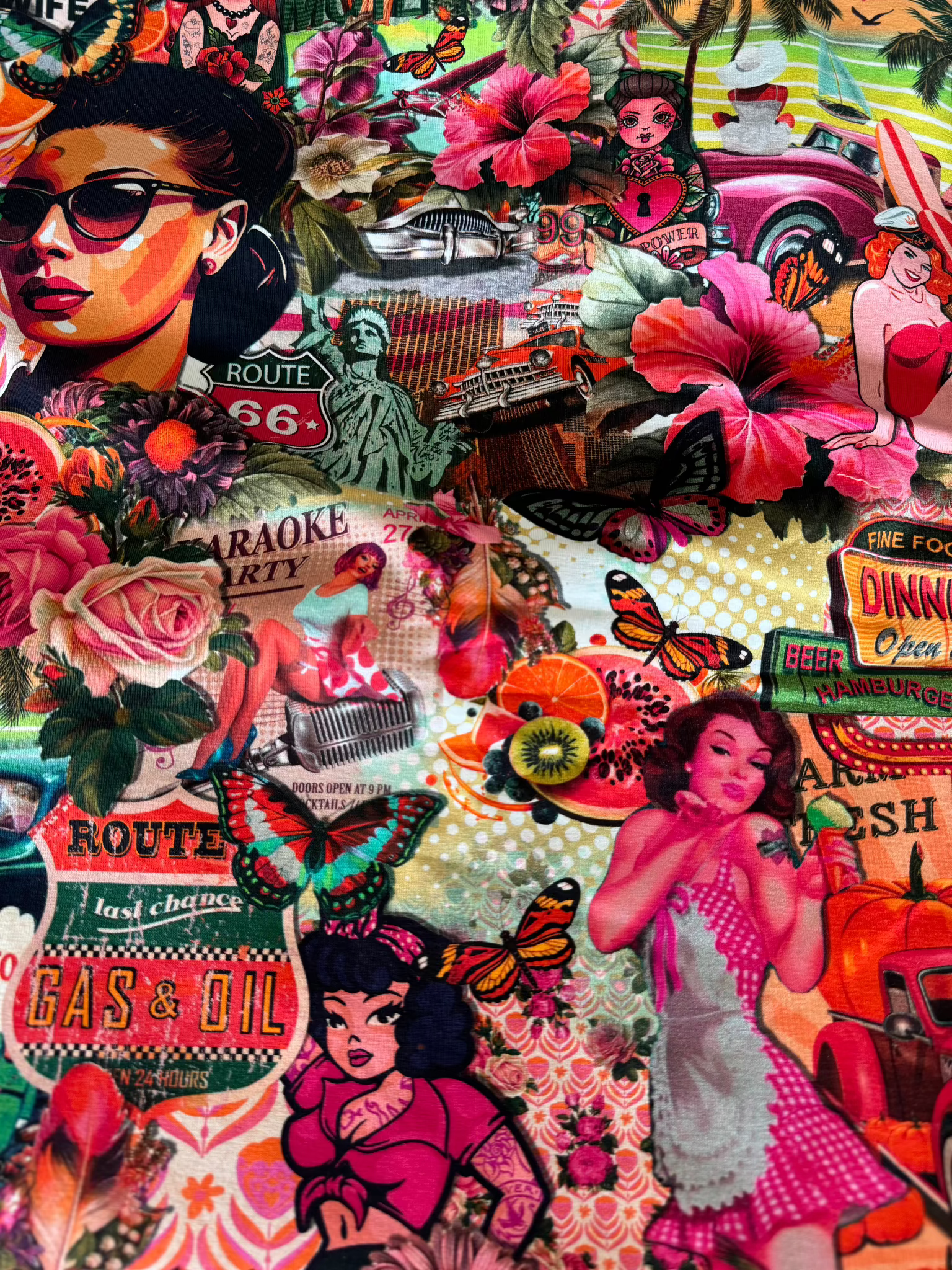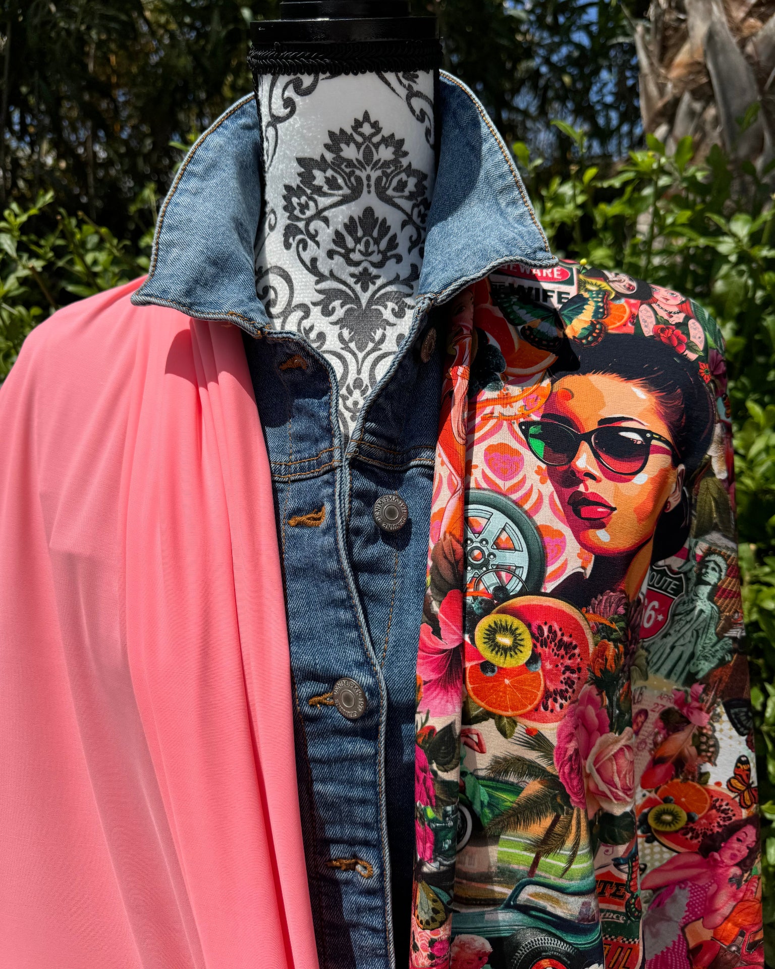 Droom jij van een uniek jasje met een sprankelende uitstraling? Route Glam neemt je mee op een reis vol kleur en karakter. De stof ademt vintage roadtrip vibes met een vleugje tropische luxe, terwijl de sierlijke bandjes zorgen voor een verfijnde touch.