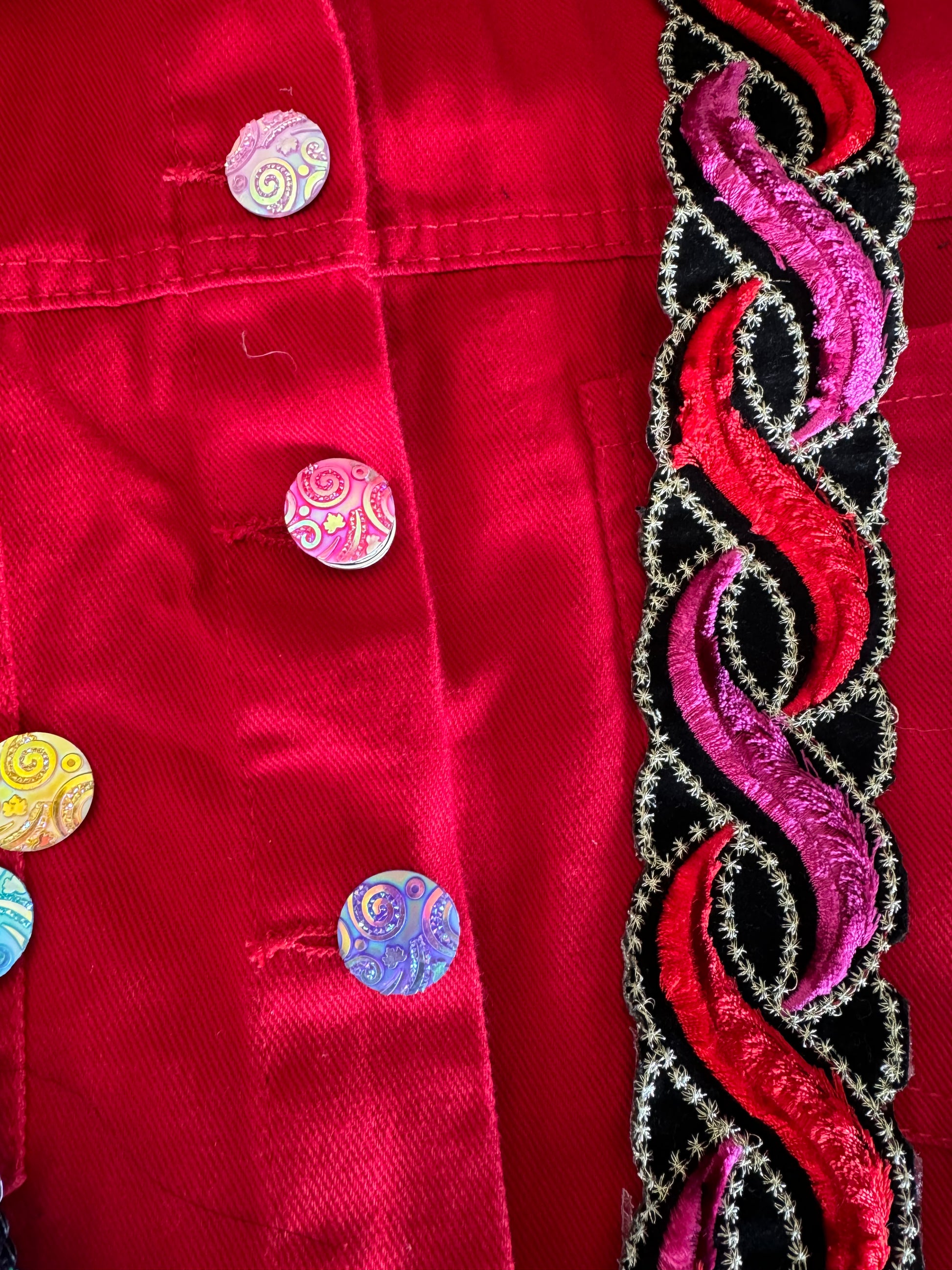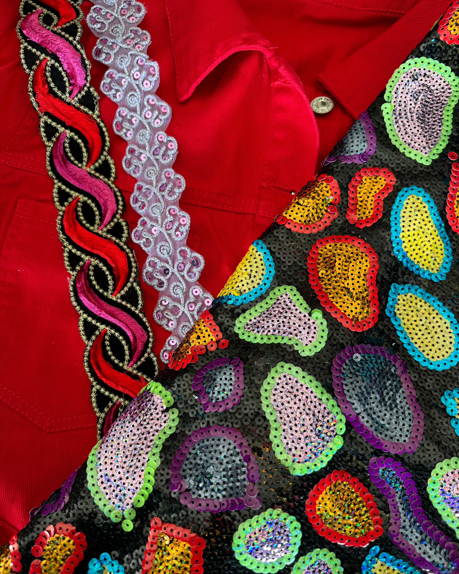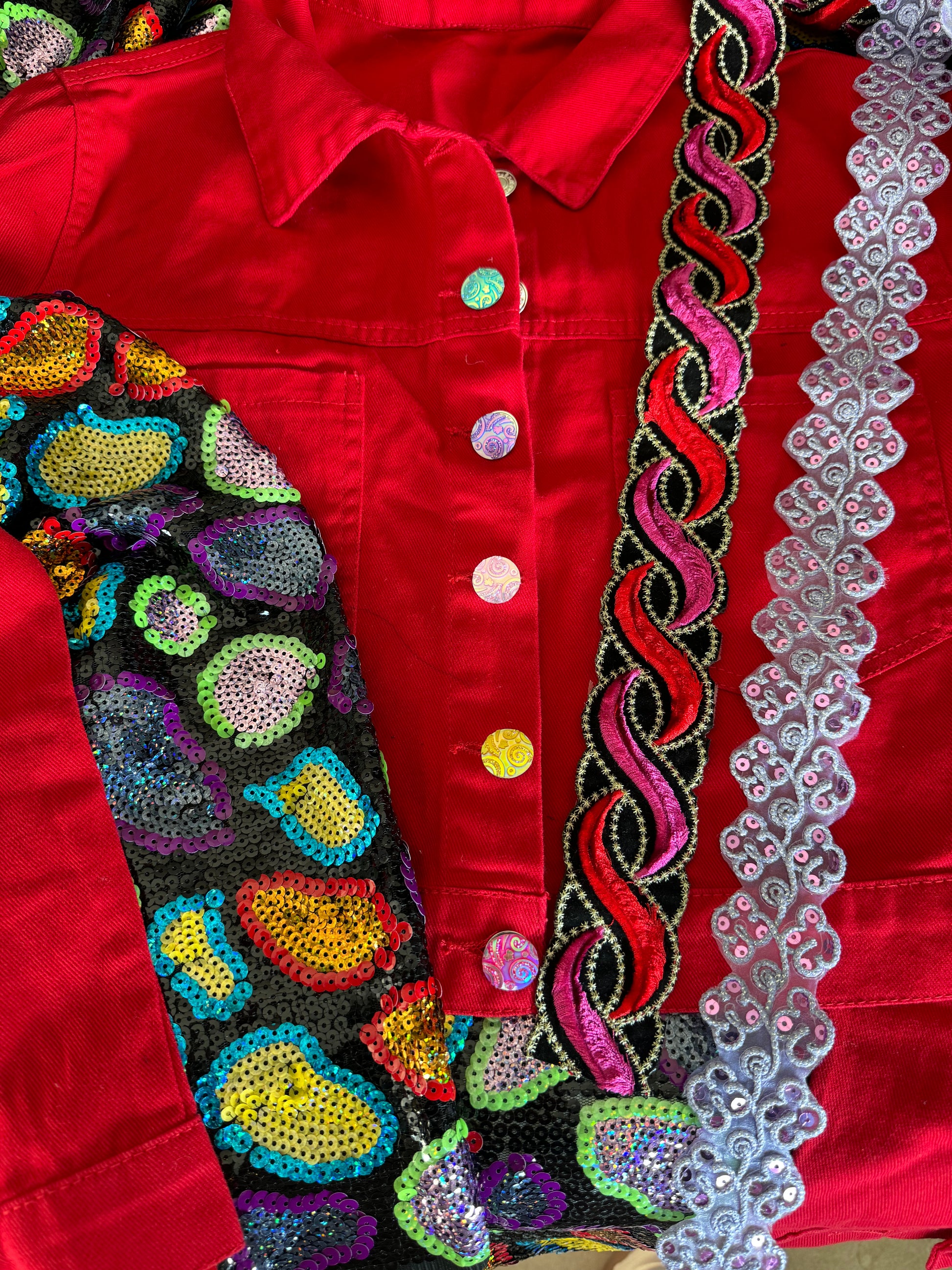 Dit jasje is pure passie en energie! Het vurige rood straalt kracht uit, terwijl de fonkelende pailletten en kleurrijke accenten een speelse en luxueuze twist geven. Wild Ember is voor de durvers, de dromers en de dansers die niet bang zijn om te schitteren.